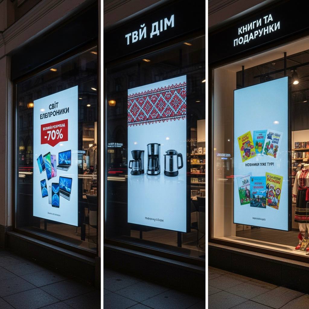 Перетворює звичайну вітрину на яскравий рекламний майданчик, який помітно навіть у сонячну погоду. Підсилює впізнаваність бренду, привертає погляди перехожих і створює сучасний вигляд фасаду. Водночас система проста в керуванні та не потребує додаткових дозволів.
