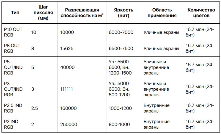 Сравнительная таблица характеристик светодиодов для LED-экранов Star Led