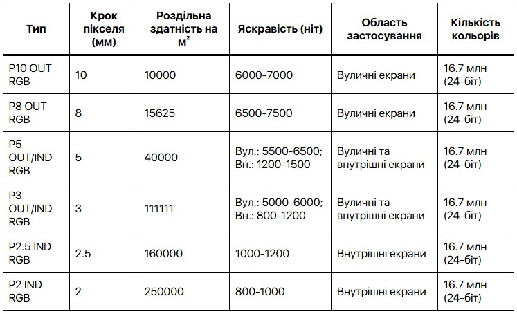 Порівняльна таблиця характеристик світлодіодів для LED-екранів Star Led